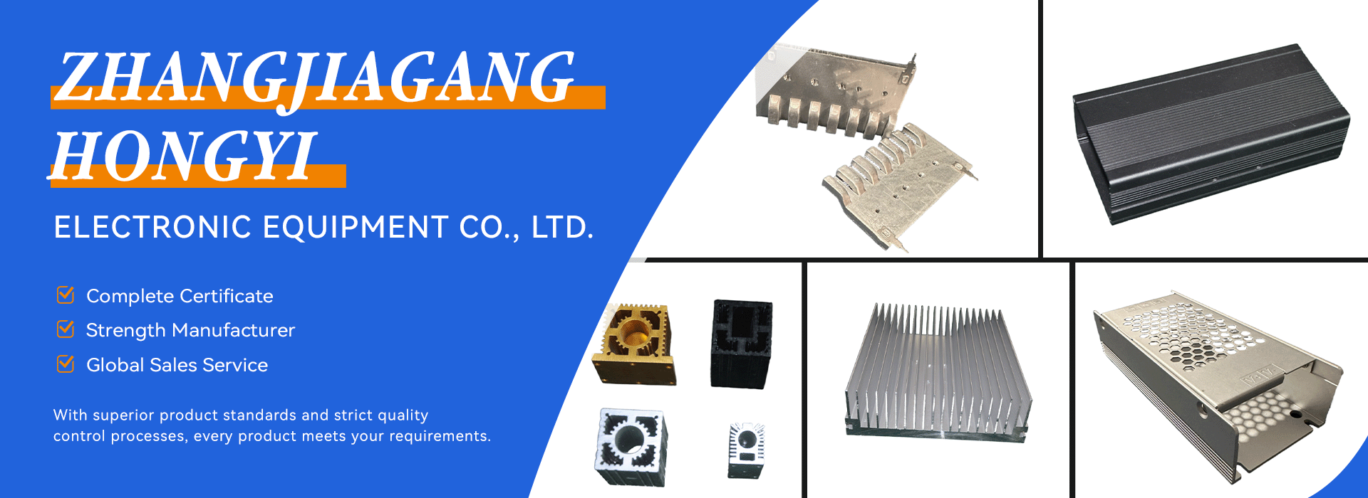 Zhangjiagang Hongyi Electronic Equipment Co., Ltd. is a company specializing in the production of electronic heat sinks series, high-power heat sinks, aluminum casings, aluminum panels, aluminum boxes, USB case shells, and various metal stamping parts. Its products are widely used in the fields of communication, electronics, power supplies, frequency converters, and household appliances. Hongyi Electronic Equipment relies on excellent technology, advanced equipment, and outstanding management to undertake various electronic heat sinks and metal products processing based on customer drawings and samples from both domestic and international markets. All products meet SGS testing standards. The company was founded in 2002 and currently has over 80 employees. It is located in Tangqiao Town, Jiagang City, Jiangsu Province, which is a convenient transportation and industrial development area in China. It is a manufacturer integrating research, development, production, and sales. The company adheres to the principle of "quality first and honest operation", and has received unanimous praise from many customers. The company strictly controls the incoming materials, meticulously manufactures, and provides customers with technologically advanced, highly performing, safe and reliable products with excellent service. The company takes the spirit of "sincerity, harmony, progress, action, innovation, and return" as its purpose, and with the quality policy of "centered on customer requirements, based on production quality, continuously improving the quality system, and improving user-satisfying products", warmly welcomes new and old customers to visit our company!